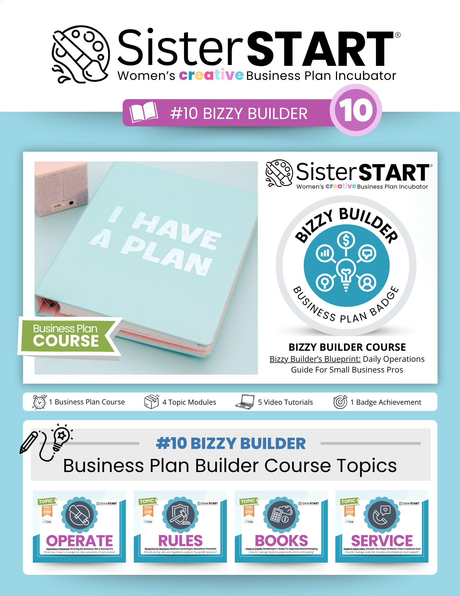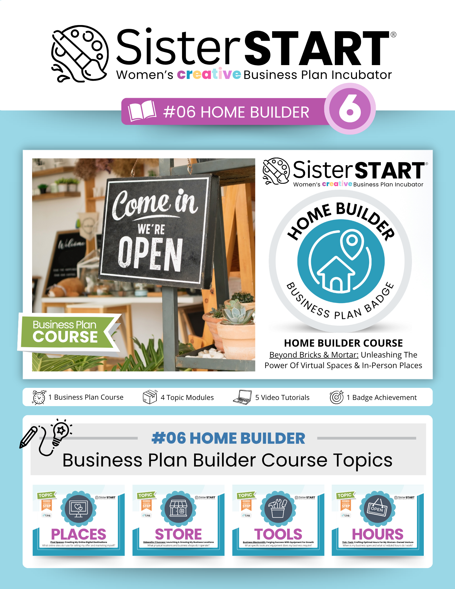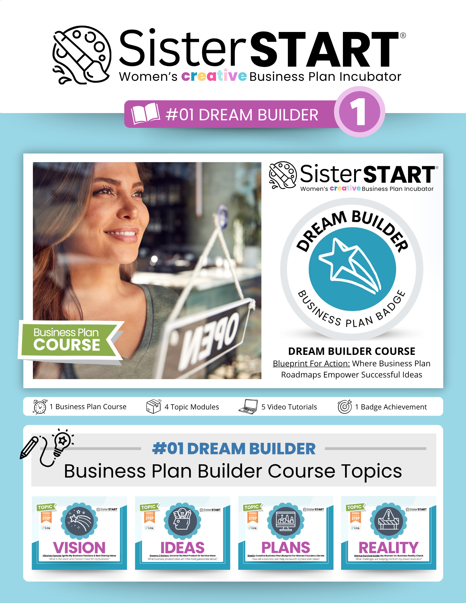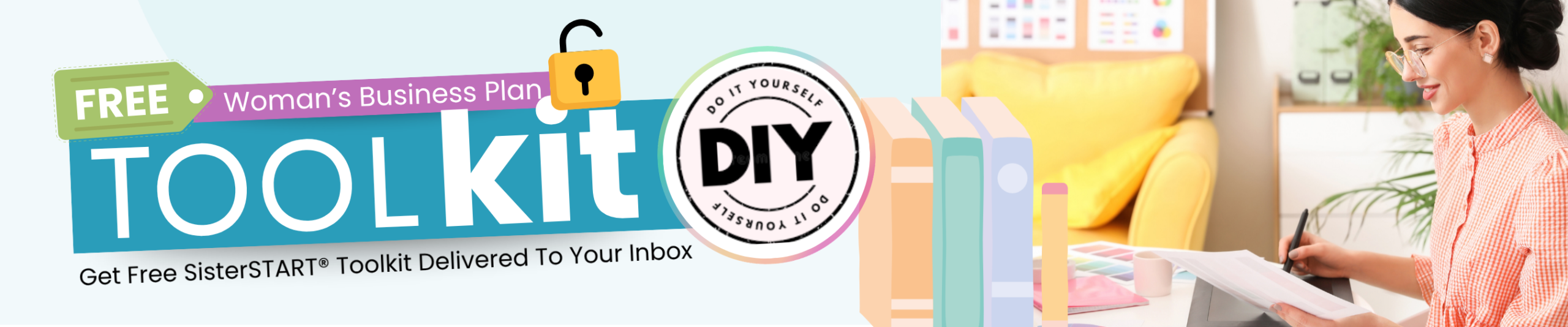 Unpack your Free SisterSTART® DIY Business Plan Builder Toolkit with on-demand video tutorials, printable worksheets, and colorful flipbooks to support your small business journey.