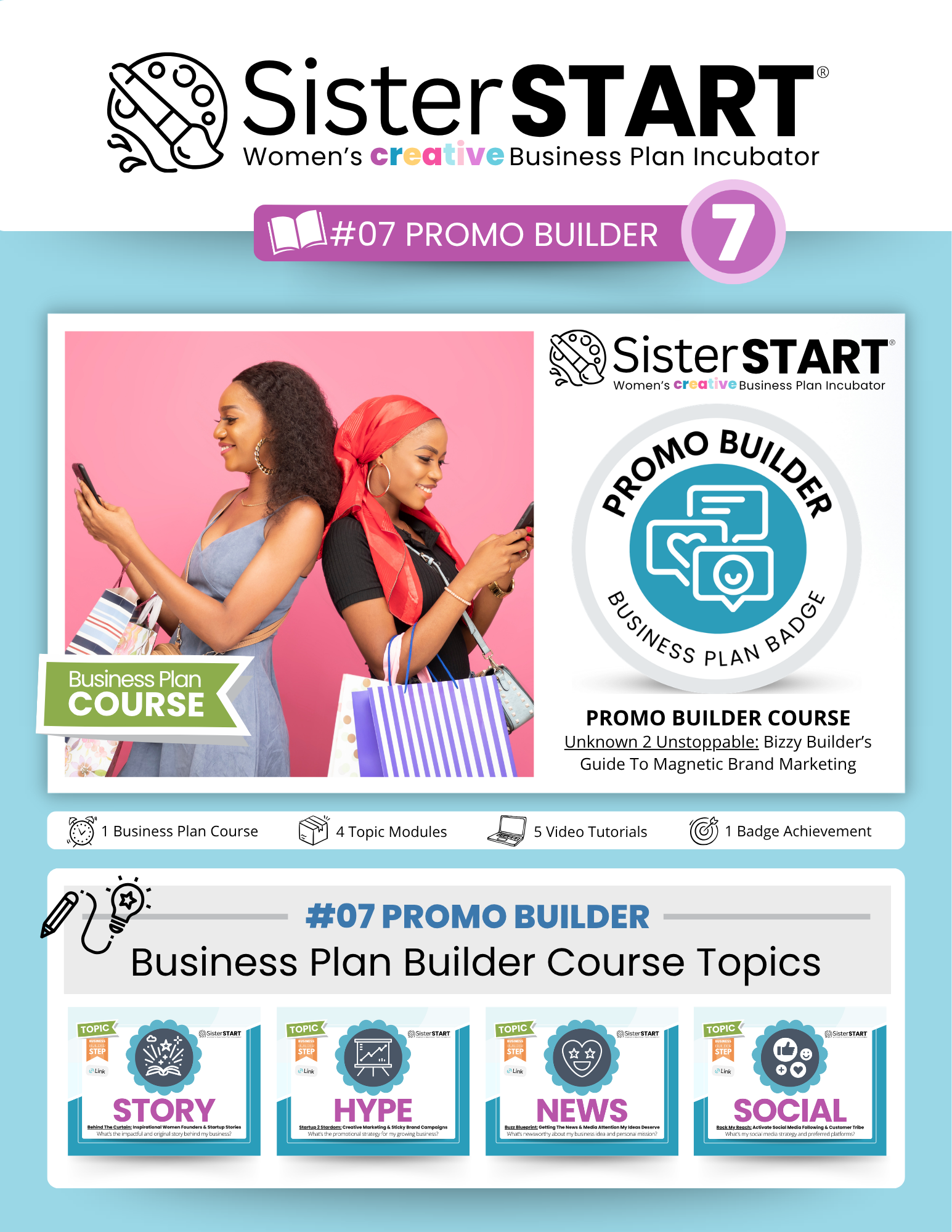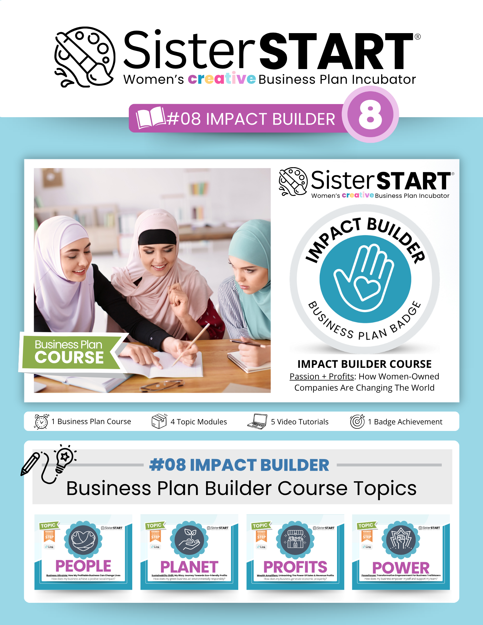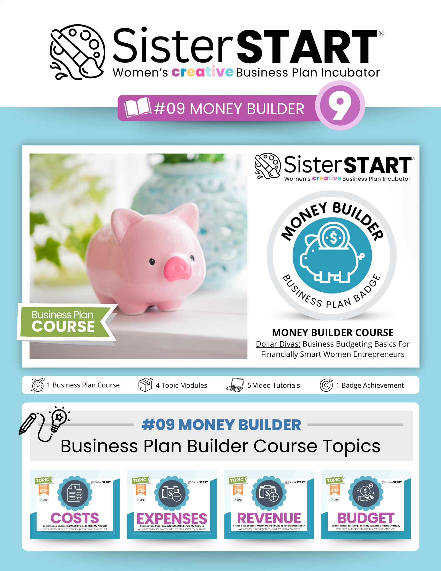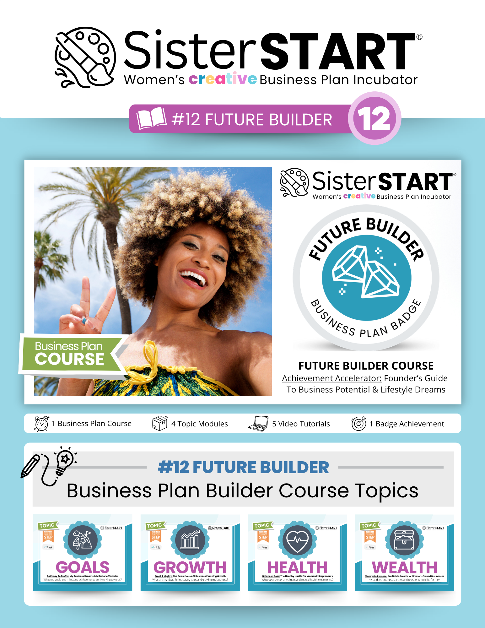 Unpack your Free SisterSTART® DIY Business Plan Builder Toolkit with on-demand video tutorials, printable worksheets, and colorful flipbooks to support your small business journey.